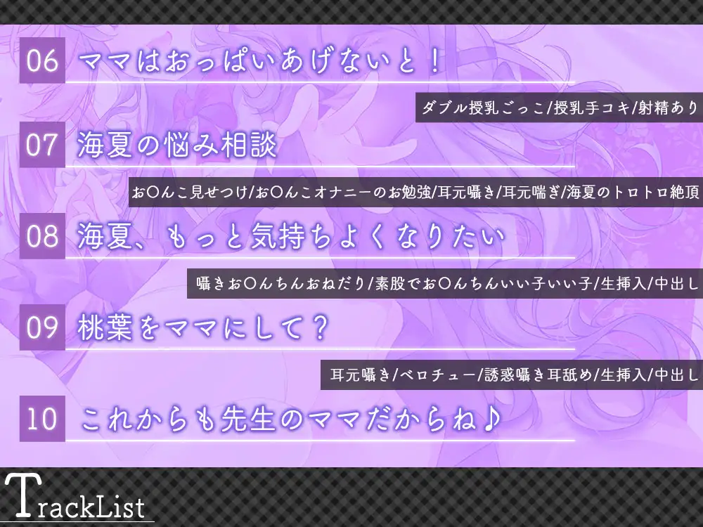 【RJ01175969】可愛いJ◯二人が貴方のママになって癒してくれるお話 CFNM 2025.10.01 マゾ度: 責め方 キス責め 手コキ 耳舐め ローション手コキ シチュエーション・プレイ CFNM 赤ちゃんプレイ 逆転なし 搾精プレイ 羞恥プレイ 女性上位 貞操観念逆転 同時責め 匂い責め 恥ずかしい行為強要 筆下ろしプレイ 連続射精 作品情報 タイトル 可愛いJ◯二人が貴方のママになって癒してくれるお話 サークル ひだまりみるくてぃ 声優 伊ヶ崎綾香 柚原みう ジャンル 癒し ASMR 中出し フェラチオ 複数プレイ/乱交 男性受け 耳舐め ささやき 発売日 2024年4月22日